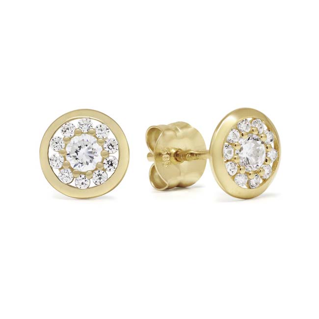 Pyöreän muotoiset kultaiset korvakorut kirkkailla zirkoneilla. Pyöreät kultakorvakorut säkenöivät kauniisti, ja niissä on tappikiinnitys. Materiaali 14 karaatin keltakulta.