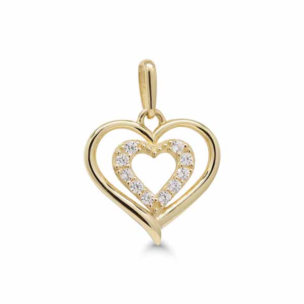 Keltakultariipus avosydän zirkoneilla - materiaali: 585/1000 (14k) keltakultaa - synteettiset zirkonit - korkeus 11,25mm (ilman riipuslenkkiä), 16,85mm kokonaisuudessaan - leveys 12,45mm... Lue lisää