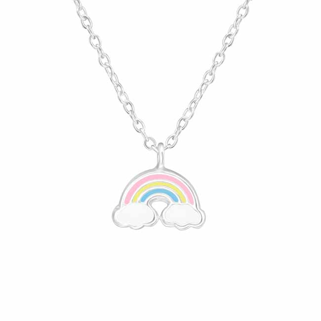 Lasten hopeariipus sateenkaari ja pilvet Lasten hopeinen sateenkaari-riipus. Tässä lasten rainbow-kaulakorussa esiintyy kaunis pastellisävyinen sateenkaari. Riipuksen koko on 9 x 6 mm ja kaulakorun... Lue lisää