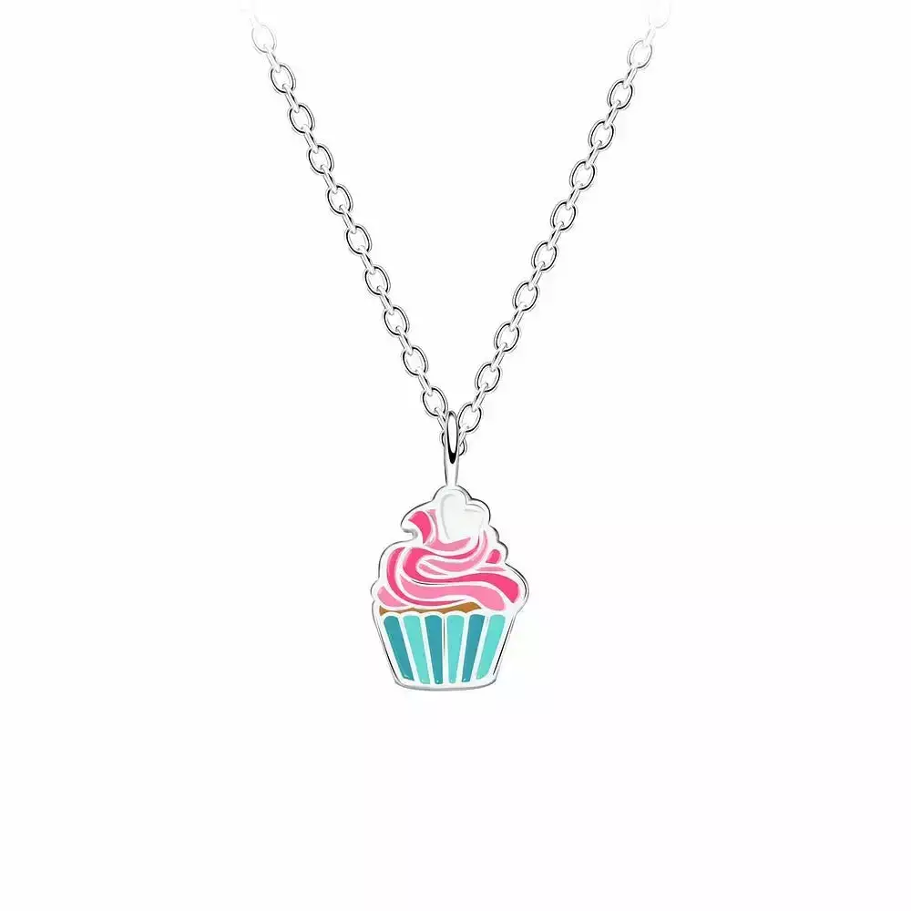 Lasten kaulakoru kuppikakku Lasten hopeinen kuppikakku-riipus. Pinkki-sinisen kuppikakun päällä on sydän. Riipuksen koko on 6 x 8 mm ja kaulakorun ketjun pituus on säädettävä 36/41 cm.... Lue lisää