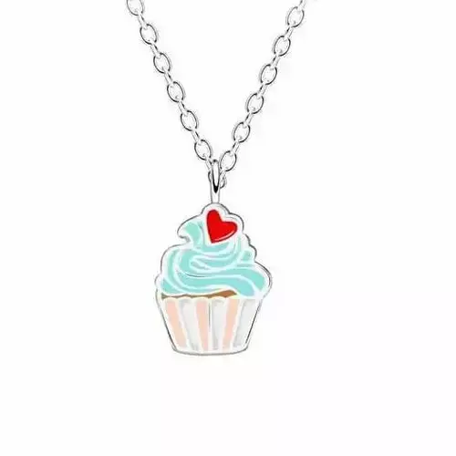 Lasten kaulakoru cupcake Lasten hopeinen kuppikakku-riipus. Vaaleansinisen kuppikakun päällä on punainen sydän. Riipuksen koko on 6 x 8 mm ja kaulakorun ketjun pituus on säädettävä 36/41 cm.... Lue lisää