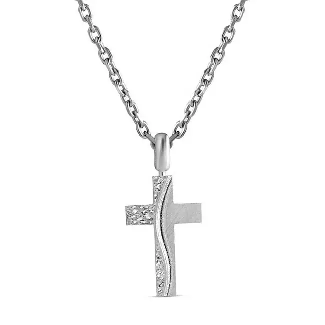 Hopeinen ristiriipus. Tässä Lempikorun Elämänpolku ristissä on rosoisisa yksityiskohtia. Korun rosoisen ja sileän osan välissä kulkee kaareva ura, joka kuvastaa elämänpolkua. Ristin korkeus on 26 mm ja leveys 12 mm ja riipuksessa on 45 cm pitkä ketju. Tätä riipusta on saatavilla kirkkaana platinoituna, tummaksi oksidoituna ja keltakultapinnoitettuna. Elämänpolku ristiriipus on tyyliltään suoralinjainen koru, joten se sopii hyvin miesten koruksi tai ylipäätään rouheammasta tyylistä pitävälle henkilölle. Symboliikkansa puolesta koru sopii hyvin rippiristiksi ja kokonsa puolesta on myös hyvä valinta rippiristiksi tytölle. Yhdistele Elämänpolku riipus samaan sarjaan kuuluvien rannekorun, solmioneulan ja kalvonsinnappien kanssa!
