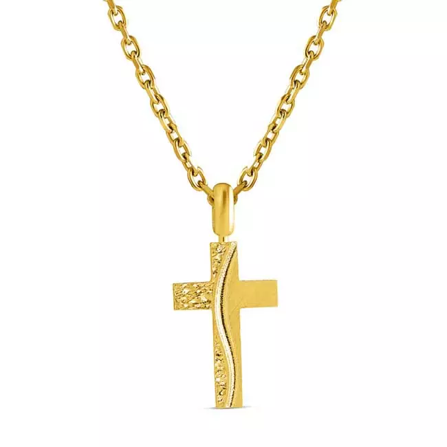 Hopeinen kullattu ristiriipus. Tässä Lempikorun Elämänpolku ristissä on rosoisisa yksityiskohtia. Korun rosoisen ja sileän osan välissä kulkee kaareva ura, joka kuvastaa elämänpolkua. Ristin korkeus on 26 mm ja leveys 12 mm ja riipuksessa on 45 cm pitkä ketju. Tätä riipusta on saatavilla kirkkaana platinoituna, tummaksi oksidoituna ja keltakultapinnoitettuna. Elämänpolku ristiriipus on tyyliltään suoralinjainen koru, joten se sopii hyvin miesten koruksi tai ylipäätään rouheammasta tyylistä pitävälle henkilölle. Symboliikkansa puolesta koru sopii hyvin rippiristiksi ja kokonsa puolesta on myös hyvä valinta rippiristiksi tytölle. Yhdistele Elämänpolku riipus samaan sarjaan kuuluvien rannekorun, solmioneulan ja kalvonsinnappien kanssa!