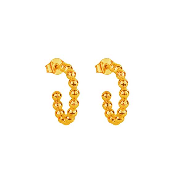 Keltakullatut hopeiset korvakorut, jotka koostuvat useista pienistä toisiinsa kiinnitetyistä hopeisista helmistä. Korvakorujen koko on 3 x 20 mm ja niissä on tappikiinnitys. Klassisen malliset korvarenkaat niin arkeen kuin juhlaan! Yhdistele Helmikki korvakorut sarjaan kuuluvien kaulakorun ja rannekorun kanssa!