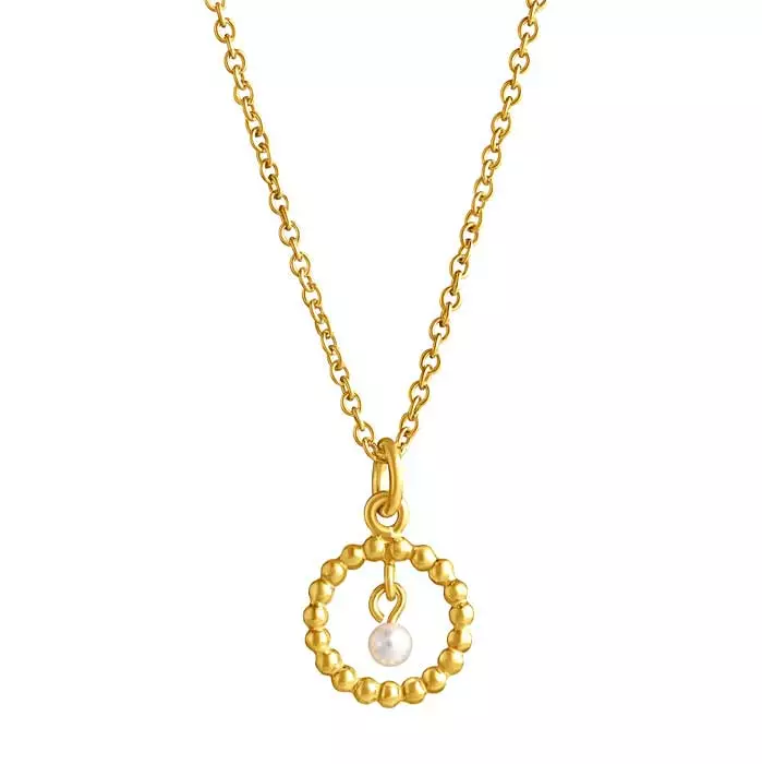 Kaunis naisten hopeariipus. Tämä riipus on valmistettu laadukkaasta sterling-hopeasta ja se on kullattu. Helmikki hopeariipuksen koruaiheena on avorengas, joka koostu useista pienistä toisiinsa kiinnitetyistä kullatuista hopeisista helmistä ja jonka keskellä riippuu vaalea helmi. Riipuksessa on säädettävä 45/50 cm pitkä ketju. Yhdistele riipus muiden Helmikki -sarjan korujen kanssa ja luo koruista kaunis kokonaisuus!