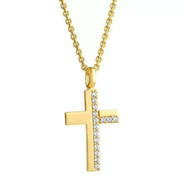 Hopeinen kullattu ristiriipus. Tätä Lempikorun Ilon hetki ristiä koristavat kirkkaat zirkonia-korukivet. Ristin korkeus on 32 mm ja leveys 17 mm. Riipuksessa on kätevä pituuksiin 45 cm sekä 50 cm säädettävä kullattu hopeaketju. Kaulakorun materiaali on laadukas sterling-hopea.