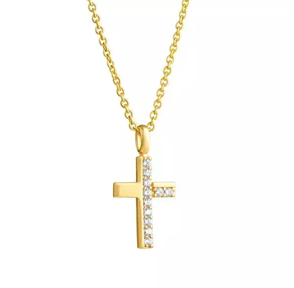 Hopeinen kullattu ristiriipus. Tätä Lempikorun Ilon hetki ristiä koristavat kirkkaat zirkonia-korukivet. Ristin korkeus on 23 mm ja leveys 12 mm. Riipuksessa on kätevä pituuksiin 45 cm sekä 50 cm säädettävä kullattu hopeaketju. Kaulakorun materiaali on laadukas sterling-hopea.