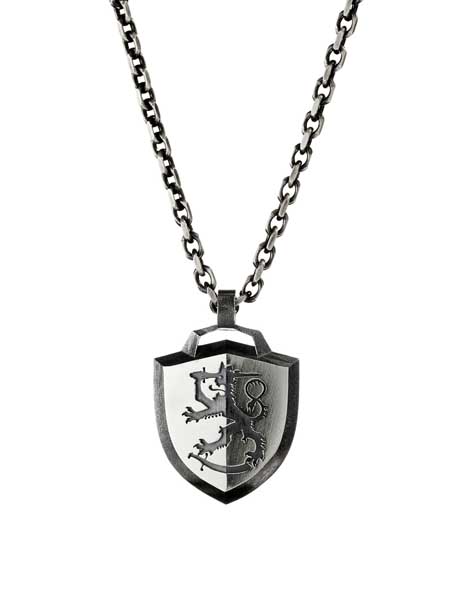 Isänmaallinen miesten kaulakoru, joka on valmistettu patinoidusta hopeasta. Patinoinnilla saadaan koruun vanhanaikainen ulkonäkö. Kilven muotoista riipusta koristaa suomileijona. Riipuksen ketjun pituus on 55 cm.