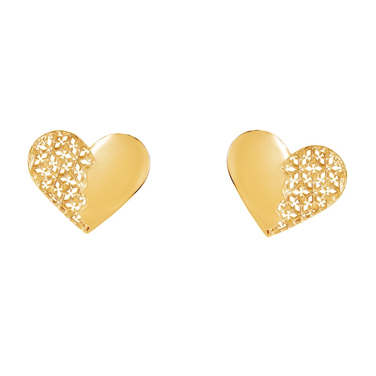 Naisten sydämen muotoiset hopeiset kullatut korvakorut. Hopeiset sydänkorvakorut on puoliksi koristeltu kauniilla lumihiutale-kuvioinnilla. Hopeakorvakorun koko on 13 x 12 mm. Kullatut korvakorut on valmistettu laadukkaasta 925 sterling-hopeasta. Nappikorvakoruissa on tukeva ja luotettava tappikiinnitys.