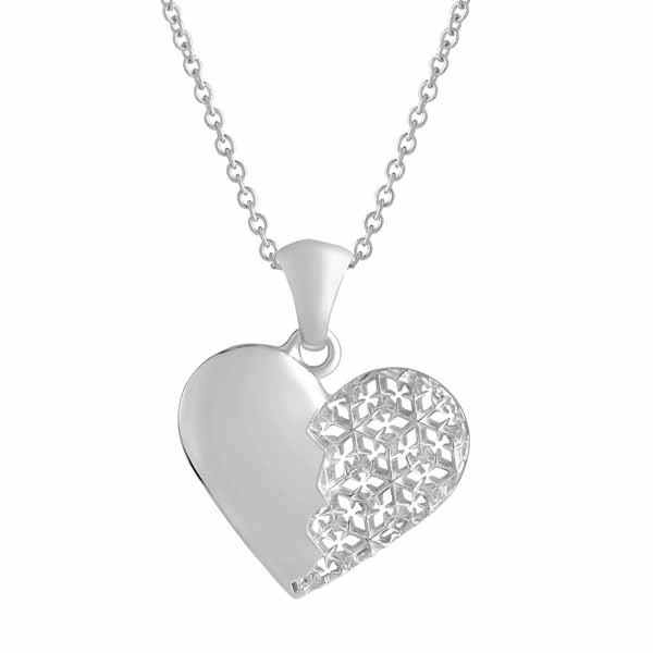 Naisten hopeinen kaulakoru sydämen muotoisella riipuksella. Sydänriipus on puoliksi koristeltu lumihiutale-kuvioinnilla. Riipuksen koko on 20 x 18 mm. Sydänkaulakoru on valmistettu laadukkaasta 925 sterling-hopeasta. Hopeaketju on kätevästi säädettävissä pituuksiin 45 cm ja 50 cm.