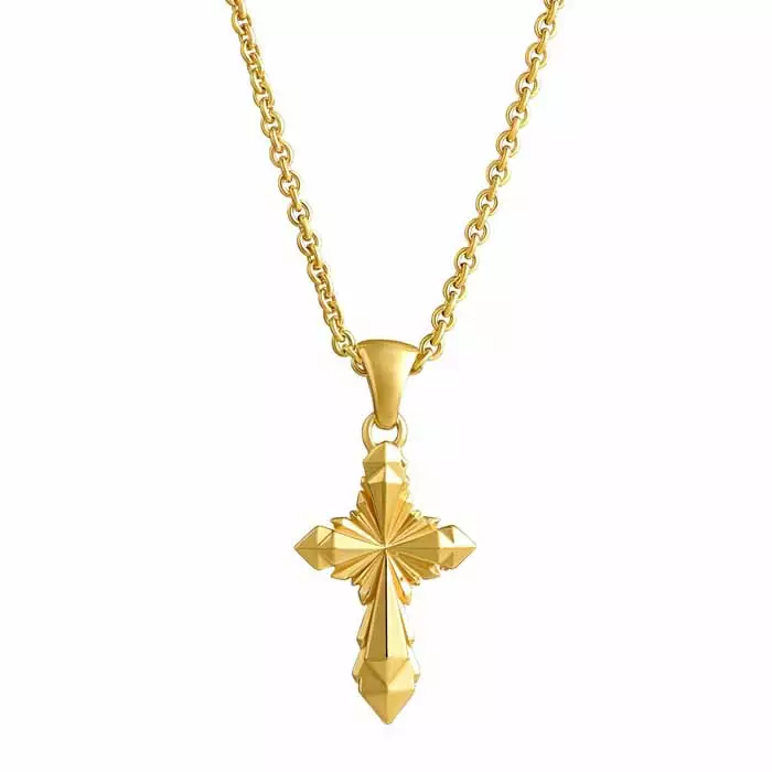 Veistoksellisesti muotoiltu hopeinen ristiriipus. Hopearistin korkeus on 30 mm ja leveys on 14 mm. Hopearistin ketju on kätevästi säädettävissä pituuksiin 45 cm ja 50 cm. Materiaali on laadukas kullattu 925 sterling-hopea.