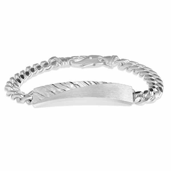 Miesten hopeinen laattarannekoru tyylikkäällä kuvioinnilla. Hopealaatan pinta on osin sileä, osin koristeltu liekkiä muistuttavalla kuvioinnilla. Laatan koko on 8 x 44 mm. Ketjun pituus on valittavissa, joko 19 cm tai 21 cm. Rannekoru on valmistettu laadukkaasta nikkelittömästä sterling-hopeasta eli 925-hopeasta.