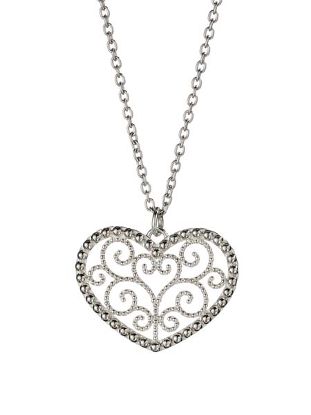 Naisten hopeariipus, jossa koruaiheena on koristellinen sydän. Sydän on klassinen ja suosittu koruaihe, joka sopii hyvin lahjaksi tärkeälle ihmiselle. Tämä Lempikoru Sydämellinen riipus on valmistettu laadukkaasta sterling-hopeasta ja ne ovat pintakäsitelty platinalla tummumisen ehkäisemiseksi. Platinoimalla myös taataan korulle paras mahdollinen väri! Koruosan leveys on 36 mm ja korkeus 28 mm ja riipuksen ketjun pituuden voit valita kahdesta vaihtoehdosta; 45 cm tai 70 cm. Tästä riipuksesta on olemassa useia eri kokoisia versioita. Yhdistele riipus muiden Sydämellinen -sarjan korujen kanssa ja luo koruista kaunis kokonaisuus!