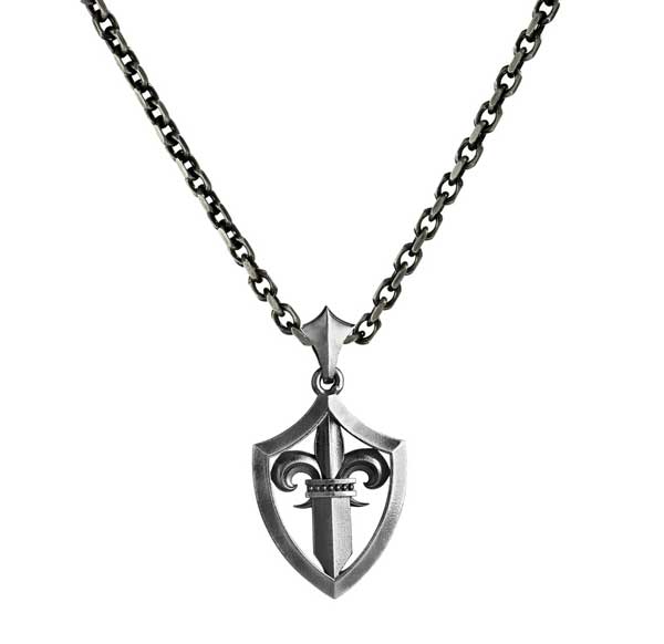 Kotimainen Lempikorun miesten riipus. Turva riipuksen muotokieli on vaakunamainen, jonka keskellä kiteytyy miekan ja kruunun muotoon usko, viisaus ja ritarillisuus. Riipus sekä ketju on patinoitu tumman sävyisiksi. Tummennus tuo koruun syvyyttä. Riipusosan koko on 31 x 21 mm ja riipuksen ketjun pituus on 55 cm. Yhdistä Turva riipus saman sarjan korvakoruhin.