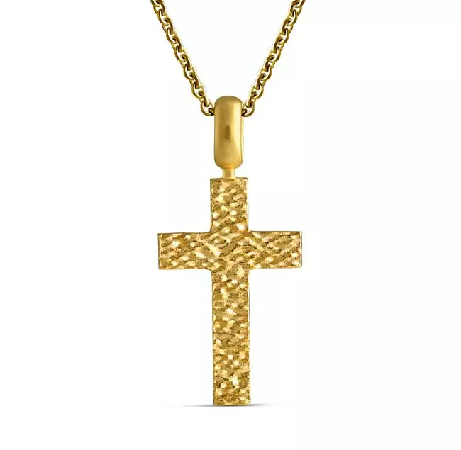 Hopeinen kullattu ristiriipus. Tässä Lempikorun Väre ristissä on eläväinen, väreilevä pintakuviointi. Ristin korkeus on 26 mm ja leveys 12 mm. Riipuksessa on kätevä pituuksiin 45 cm sekä 50 cm säädettävä hopeaketju. Kaulakorun materiaali on laadukas sterling-hopea.