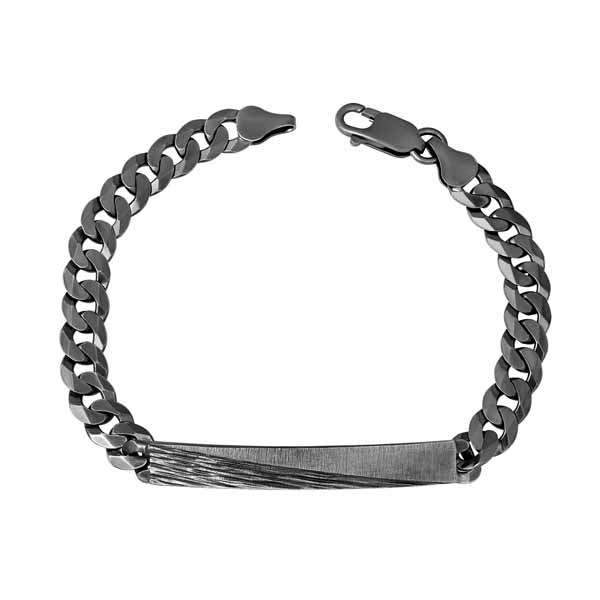 Miesten tummennettu hopeinen laattarannekoru tyylikkäällä kuvioinnilla. Laatan koko on 6 x 43 mm. Ketjun pituus on valittavissa, joko 19 cm tai 21 cm. Rannekoru on valmistettu laadukkaasta nikkelittömästä sterling-hopeasta eli 925-hopeasta, joka on patinoitu tyylikkään tumman ilmeen luomiseksi.