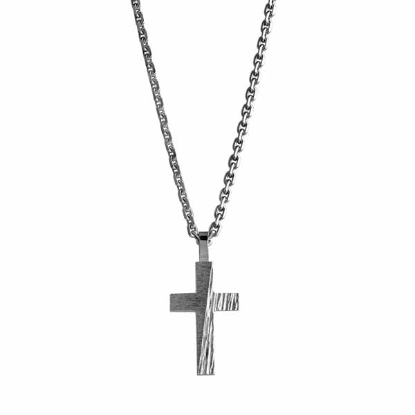 Hopeinen ristikaulakoru. Risti on puoliksi kuvioitu tyylikkäällä rosoisella kuvioinnilla. Hopearisti on kooltaan 24 x 12 mm. Riipuksen hopeaketju on säädettävissä pituuksiin 45 cm ja 50 cm. Kaulakoru on valmistettu laadukkaasta 925 sterling-hopeasta.