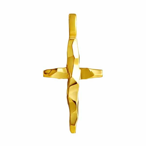 Ainutkertaisesti muotoiltu kultainen ristiriipus. Vuolu kultaristin pinta on kuin puun, jota on vuoltu kirveellä. Kultaristi on kooltaan 12 x 24 mm. Riipus on valmistettu laadukkaasta 14 karaatin keltakullasta. Ei sisällä ketjua.