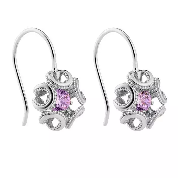 Kotimaiset Lumoava Alma -korvakorut laadukkaasta rodinoidusta hopeasta. Korun herkkää, pitsimäistä muotoilua ja vaaleanpunaista zirkoniaa on inspiroinut viktoriaaninen estetiikka.