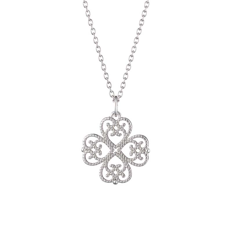 Kotimainen naisten hopeinen riipus. Neliapilan muotoinen hopeakaulakoru koostuu hopeisista filigraanisydämistä. Riipuksen koko on 21 x 22 mm. Ketjun pituus on säädettävä 45/50 cm.