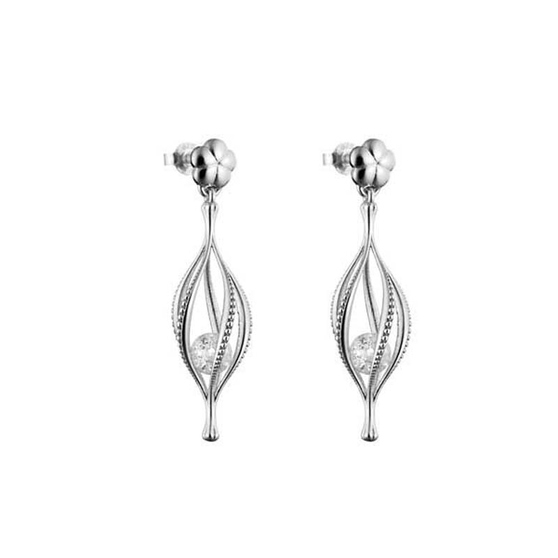 Kotimaiset naisten hopeiset roikkuvat korvakorut. Kierteen muotoisen hopeakorvakorun sisällä on kauniin särötetty vuorikidepallo, joka voi liikkua kierteen sisällä vapaasti. Näissä roikkuvissa hopeakorvakoruissa on tukeva tappikiinnitys. Hopeisten korvakorujen koko on 12 x 45 mm.