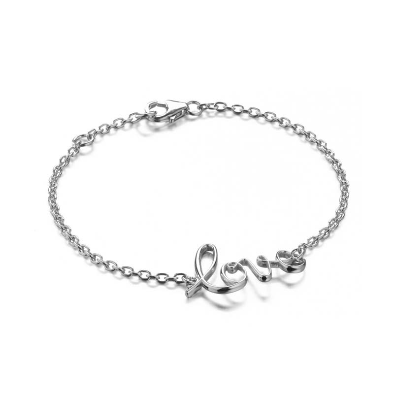 Kotimainen naisten hopeinen rannekoru. Kauniissa hopeariipuksessa lukee kaunokirjoituksella "love", eli rakkaus. Valmistusmateriaali on laadukas 925 sterling-hopea. Hopeisen riipuksen koko on 28 x 17 mm. Koruosa on muotoiltu mukailemaan rannetta. Hopeaketju on säädettävissä pituuksiin 18 cm ja 19,5 cm.