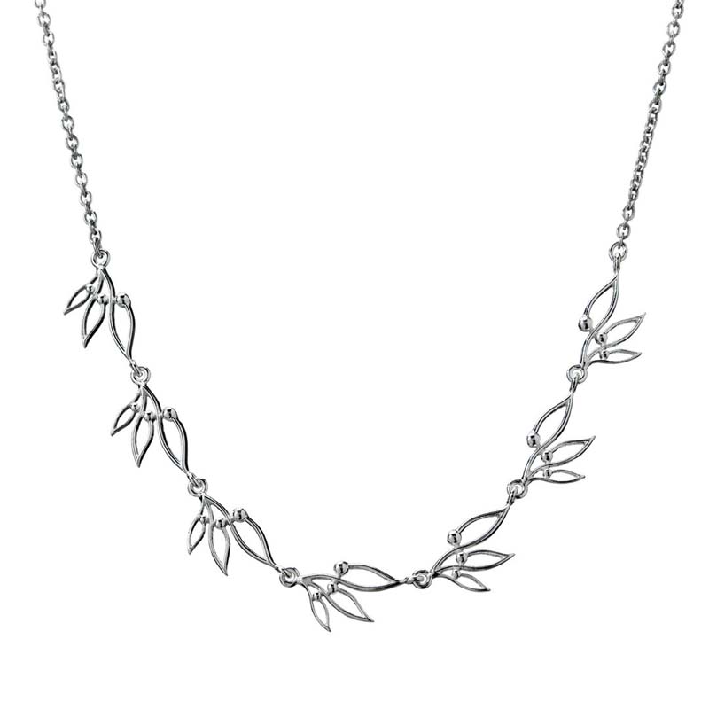 Naisten kotimainen hopeinen kaulakoru. Hopeakaulakoru koostuu ketjusta sekä seitsemästä korunosasta, joissa on pihlajanoksaa muistuttava kuvio lehdillä ja marjoilla. Hopeaketjun pituus on valittavissa kahdesta vaihtoehdosta: säädettävä 40/45 cm ja säädettävä 48/53 cm. Kaulakorun materiaali on laadukas 925 sterling-hopea.