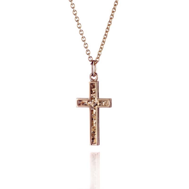 Rosoinen kultaristi. Tässä Lumoavan Polku kultaisessa ristissä sirot reunukset kehystävät keskustan rouheaa pintakuviota. Kultaristi on valmistettu 99% kierrätetystä 14 karaatin keltakullasta. Näyttävän ristin mitat on 12 x 23 cm, riipusketjun pituus on 45 cm. Lumoava Polku risti on tarinansa puolesta erinomainen rippiristi nuorelle, ristin koko ja muotoilu sopii niin tytölle kuin pojallekin. Ristin taakse mahtuu kaiverrus.