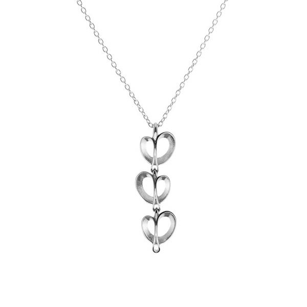 Kotimainen naisten hopeinen kaulakoru. Tämä hopeakaulakoru ihastuttaa luonnonläheisellä muotokielellään. Hopeariipus on kolmiosainen ja sen koko on 11 x 39 mm. Kaulakorun hopeaketjun pituus on säädettävissä pituuksiin 45 cm ja 50 cm. Valmistusmateriaali on laadukas 925 hopea.