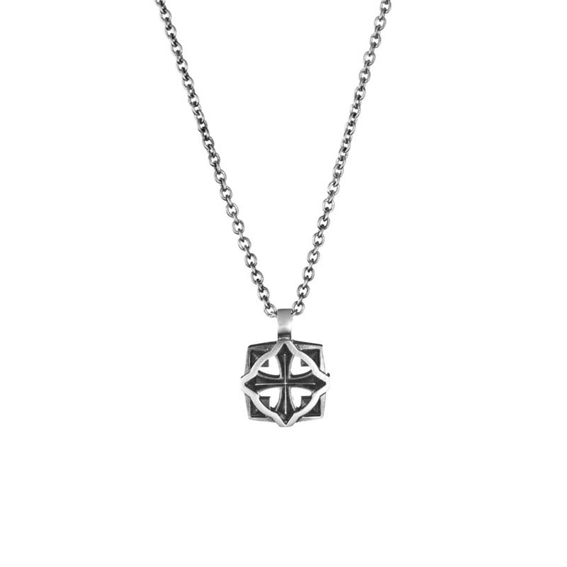 Kotimainen miesten tummennettu hopeinen kaulakoru. Siron hopeariipuksen koko on 11 x 15 mm ja se on valmistettu laadukkaasta 925 sterling-hopeasta. Riipus on oksidoitu tumman ilmeen luomiseksi. Ketjun pituus on valittavissa kahdesta vaihtoehdosta, säädettävä 36/40 cm ja säädettävä 45/50 cm. Lyhyemmällä ketjulla kaulakoru sopii erinomaisesti kasteriipukseksi pienelle soturille.