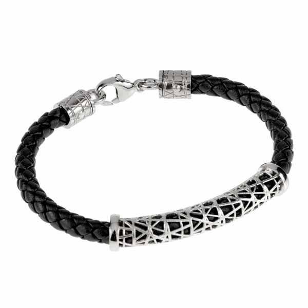 Kotimainen nahkarannekoru geometrisellä kuvioinnilla. Tyylikäs hopearannekoru koostuu pitkulaisen mallisesta helasta ja aidosta nahkaisesta ketjusta. Rannekorun pituus on valittavissa vaihtoehdoista 19,5 cm, 21 cm ja 23 cm. Hopeisen helan koko on 54 x 10 mm. Tämä käsikoru sopii miehelle ja naiselle!