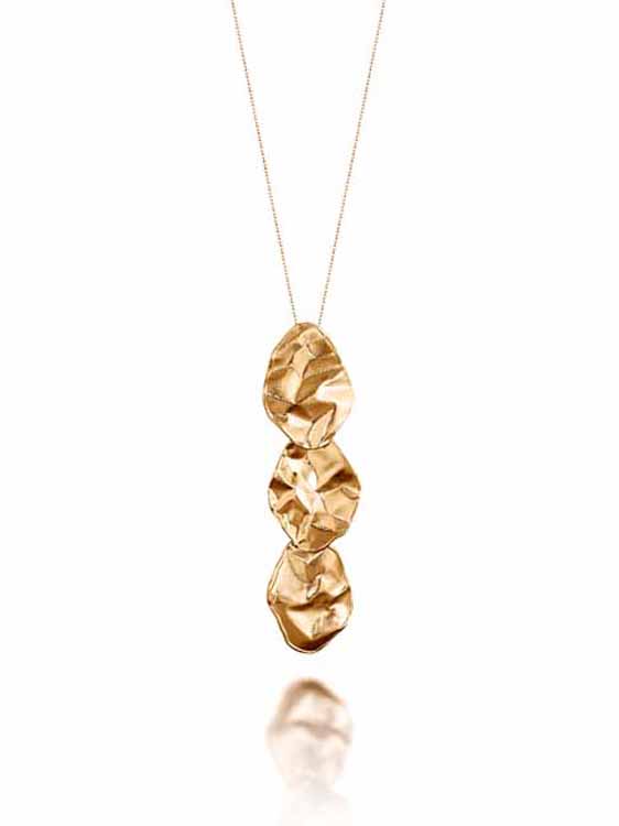 Naisten kotimainen keltakultainen riipus. Tämä näyttävä kultakaulakoru ihastuttaa rosoisella mutta kiiltävällä ilmeellään. Keltakultainen riipus on kolmiosainen ja sen koko on 16 x 63 mm. Korua saatavilla kahdella eri pituudella 45 cm ja 50 cm. Valmistusmateriaali on laadukas 14 karaatin keltakulta.