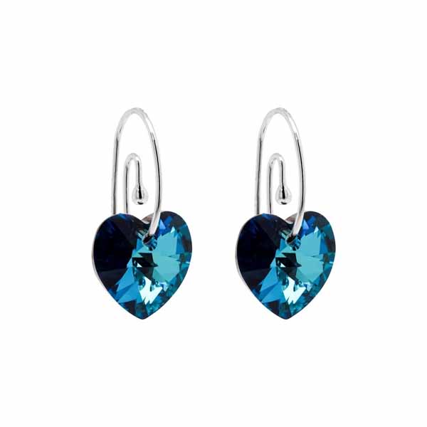 Naisten hopeiset korvakorut sydämen muotoisilla sinisillä kristalleilla. Näissä rodinoiduissa hopeakorvakoruissa on tyylikäs spiraalimainen muotoilu. Koruosan koko on 14 mm. Korvakoruissa on koukkukiinnitys. Korvakorujen materiaali on laadukas nikkelitön 925 sterling-hopea.