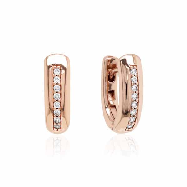 Naisten ruusukullatut rengaskorvakorut säihkyvällä zirkonia-rivistöllä. Korvarenkaan leveys on noin 5 mm ja korkeus noin 15 mm. Korvakoruissa on kätevä saranakiinnitys. Korvakorujen materiaali on laadukas nikkelitön 925 sterling-hopea.