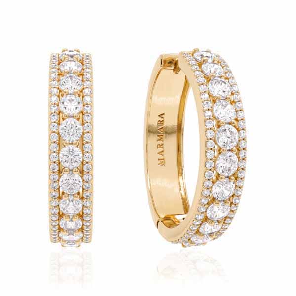 Naisten hopeiset korvarenkaat kirkkailla zirkonia-korukivillä. Näissä näyttävissä kullatuissa rengaskorvakoruissa säkenöivät kirkkaat eri kokoiset pyöreät korukivet. Korvarenkaan leveys on 5 mm ja ulkohalkaisija 25 mm. Korvakoruissa on kätevä saranakiinnitys. Korvakorujen materiaali on laadukas nikkelitön 925 sterling-hopea.