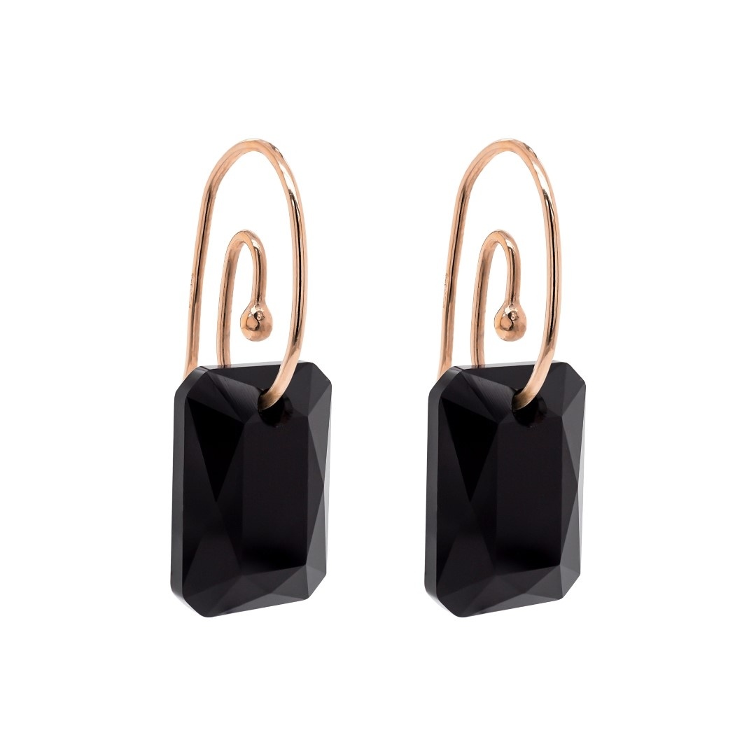 Naisten hopeiset korvakorut Swarovskin kristalleilla. Näissä ruusukullatuissa korvakoruissa roikkuvat suorakulmaiset mustat Swarovskin kristallit. Korvakoruissa on koukkukiinnitys. Kiven koko on 16 mm. Korvakorujen materiaali on laadukas nikkelitön 925 sterling-hopea.