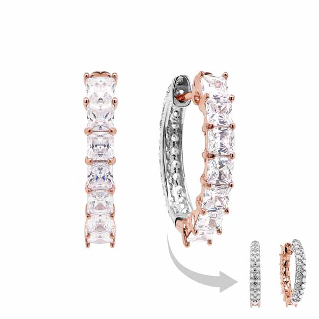 Naisten hopeiset korvakorut Swarovskin kristalleilla. Näissä ruusukullatuissa rengaskorvakoruissa on istutettu kirkkaat kulmikkkaat Swarovskin kristallit toiselle puolelle ja pyöreät kristallit kahdessa rivissä toiselle. Kumpi puoli on tänään sinun suosikkisi? Puolet korvakorusta on ruusukullattu, joten voit vaihtaa tyyliäsi hetkessä. Tämän rengaskorvakorun halkaisija on 15-18 mm. Korvakoruissa on saranakiinnitys. Korvakorujen materiaali on laadukas nikkelitön 925 sterling-hopea.