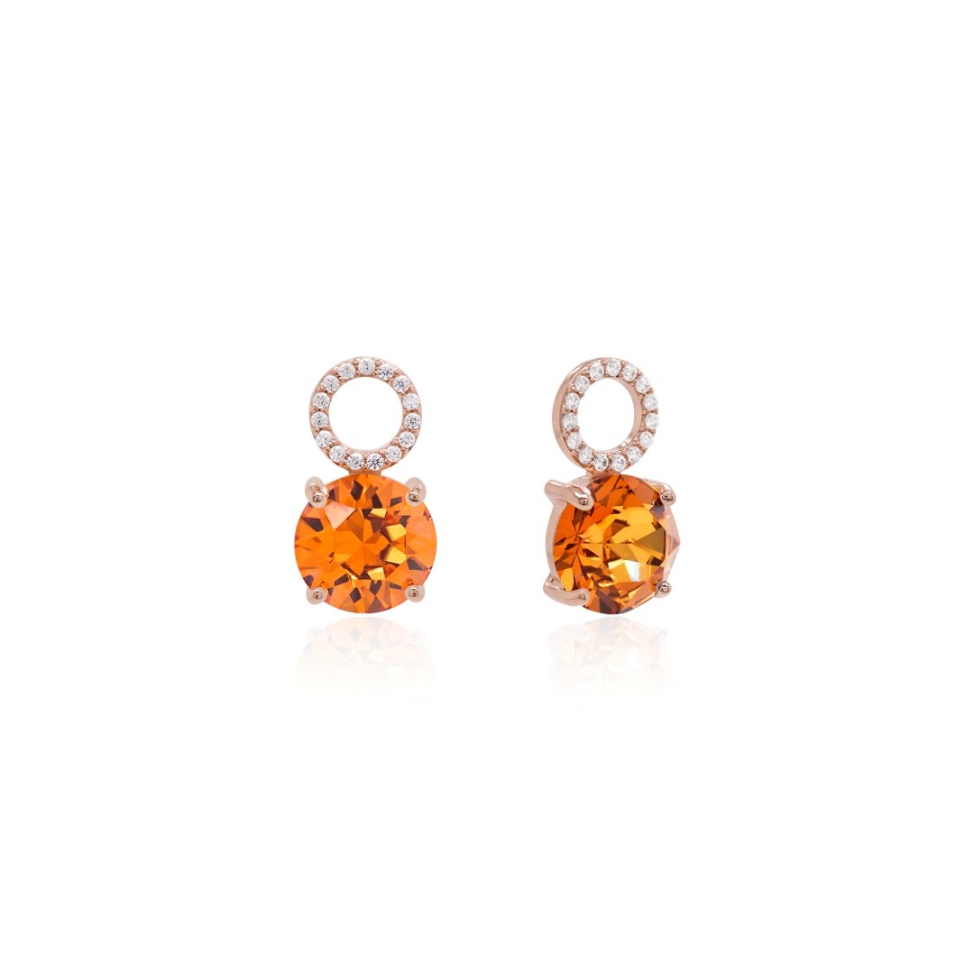 Naisten hopeiset korvakoruhelat Swarovskin kristalleilla. Nämä ruusukullatut korvakoruhelat on koristeltu säihkyvillä Swarovskin kristalleilla. Helan renkaaseen on istutettu kauttaaltaan kirkkaat zirkoniat ja niissä roikkuvat oranssit Swarovskin kristallit. Helat sopivat yhteen rengaskorvakorujen kanssa, joista ne voivat roikkua. Helojen materiaali on laadukas nikkelitön 925 sterling-hopea.