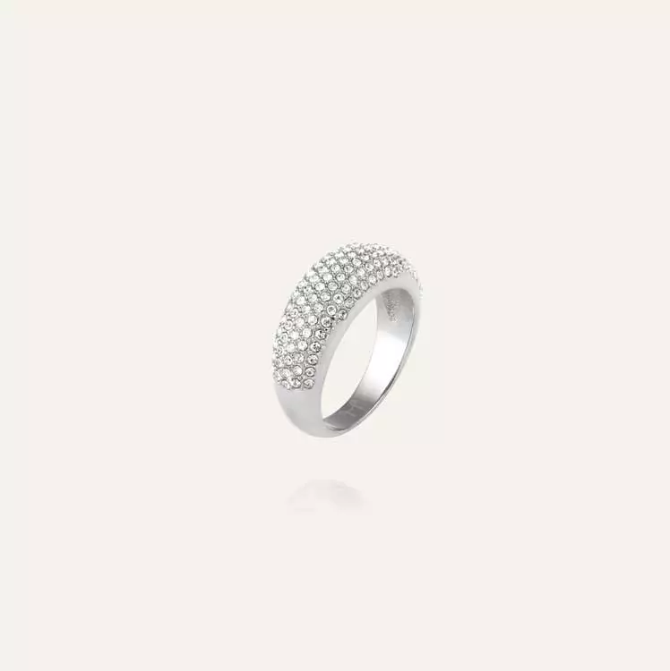 Mockberg Treasure Ring on näyttävä uudelleentulkinta suositusta Bold Ring -sormuksesta. Sen pyöristetty ja leveä muotoilu on koristeltu kauttaaltaan säihkyvillä kuutiollisilla zirkonioilla. Tämä sormus on täydellinen käytettäväksi yksinään näyttävänä statement-koruna tai osana useamman sormuksen yhdistelmää. Sormus on valmistettu kestävästä ruostumattomasta teräksestä ja viimeistelty PVD-pinnoitteella, joten voit käyttää sitä huoletta joka päivä sen säilyttäessä upean värinsä ja kiiltonsa.