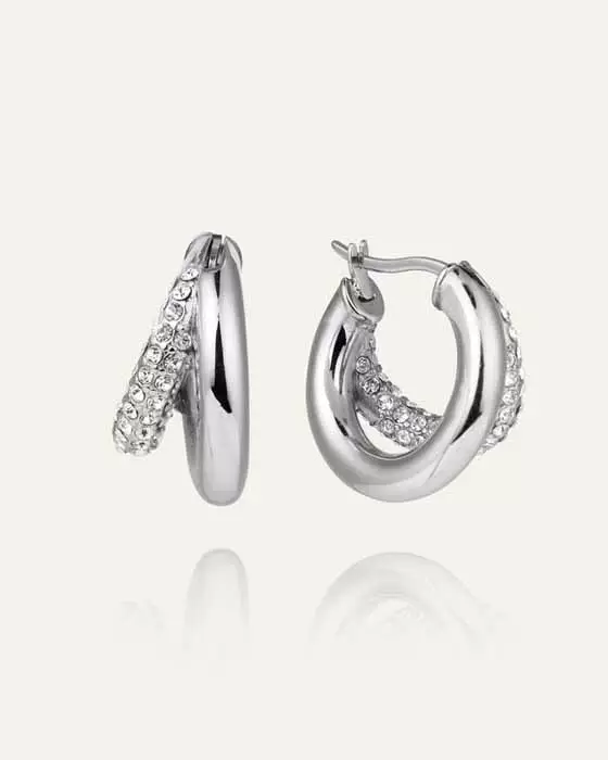 Mockberg x Kenza Raya on upea korupari, jossa yhdistyy klassinen muotoilu ja moderni säihke. Nämä hopeanväriset korvarenkaat on valmistettu laadukkaasta ruostumattomasta teräksestä, ja niiden pintaa koristavat kauniit, valoa taittavat zirkonia-korukivet. 20 mm kokoiset renkaat ovat näyttävät mutta silti kevyet käyttää. Korvakoruissa on kätevä saranakiinnitys.