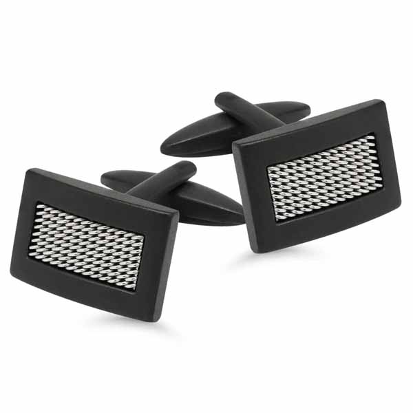 Miesten teräksiset kalvosinnapit. Näistä mustista kalvosinnapeista löytyvät keskeltä tyylikkäät verkkokoristeet. Kalvosinnapit on valmistettu ruostumattomasta teräksestä. Teräskalvosinnappien leveys on 18 mm ja korkeus 12 mm.