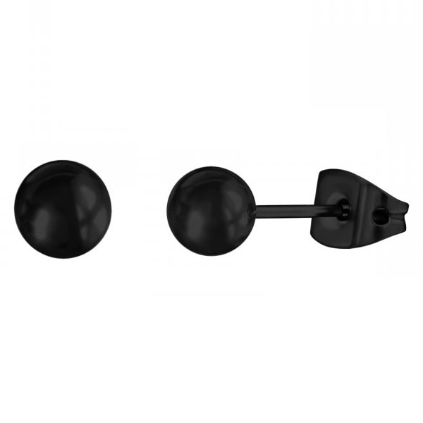 Mustat pallokorvakorut. Nappikorvakorujen koko on 5 mm ja niissä on luotettava tappikiinnitys. Valmistusmateriaali on laadukas allergisoimaton titaani, joka on pinnoitettu mustaksi