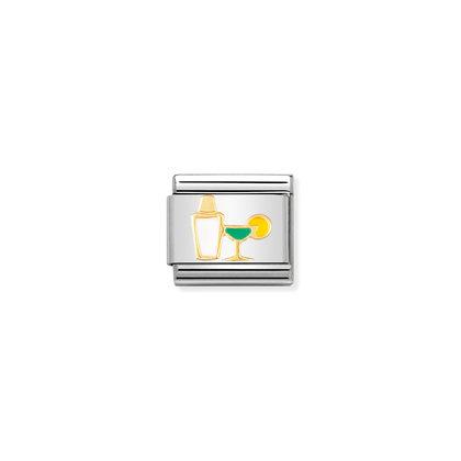 Nomination Classic Gold sarjan drinkkiravistin ja lasi -pala. Cocktail shaker on emaloitu valkoiseksi ja lasi vihreäksi. Koruosa on 18 karaatin keltakultaa.