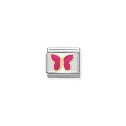 Nomination Classic Gold sarjan fuksian sävyinen perhonen-pala. Koruosa on 18 karaatin keltakultaa. Sopii rannekkeeseen kauniiksi koristeeksi tai fuksian sekä perhosten ystävälle.