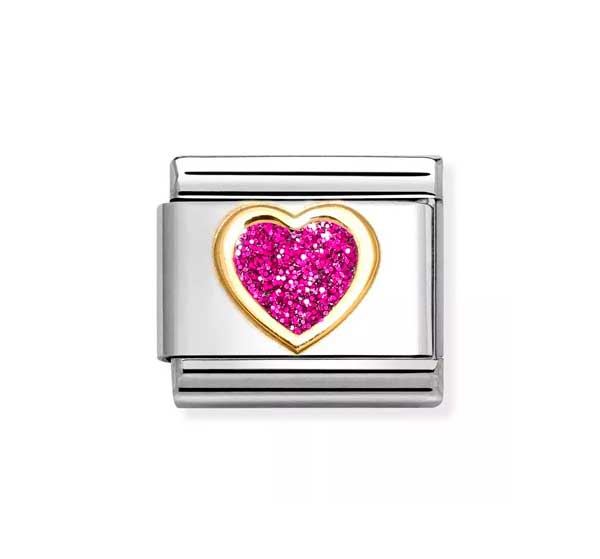 Nomination Classic Gold sarjan fuksian sävyinen glittersydän-pala. Koruosa on 18 karaatin keltakultaa.
