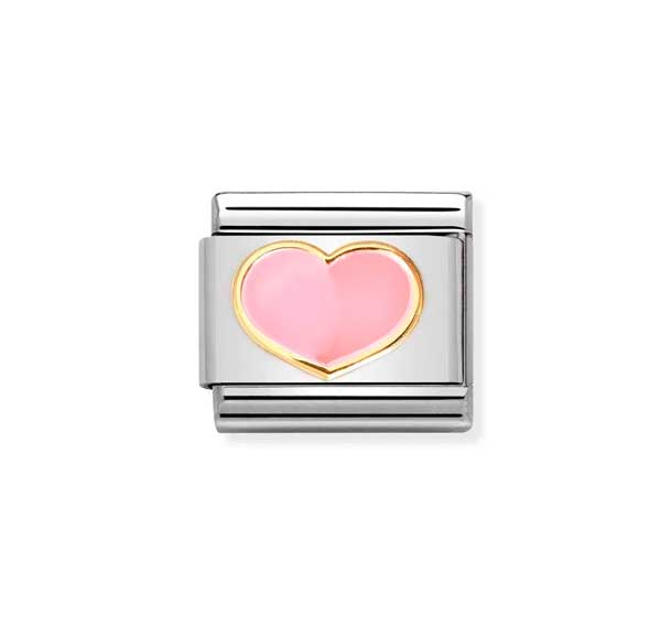 Nomination Classic Gold sarjan vaaleanpunaisen sävyinen sydän-pala. Palassa on emaloitu sydän kultaisilla reunoilla. Koruosa on 18 karaatin keltakultaa. Sopii koristamaan monenlaista Nomination-ranneketta!