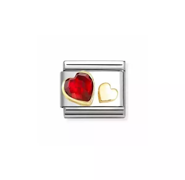Nomination Classic Gold sarjan sydän-pala punaisella zirkonia-korukivellä. Koruosa on 18 karaatin keltakultaa. Tämä kaunis pala sopii koristamaan monenlaista Nomination-ranneketta!