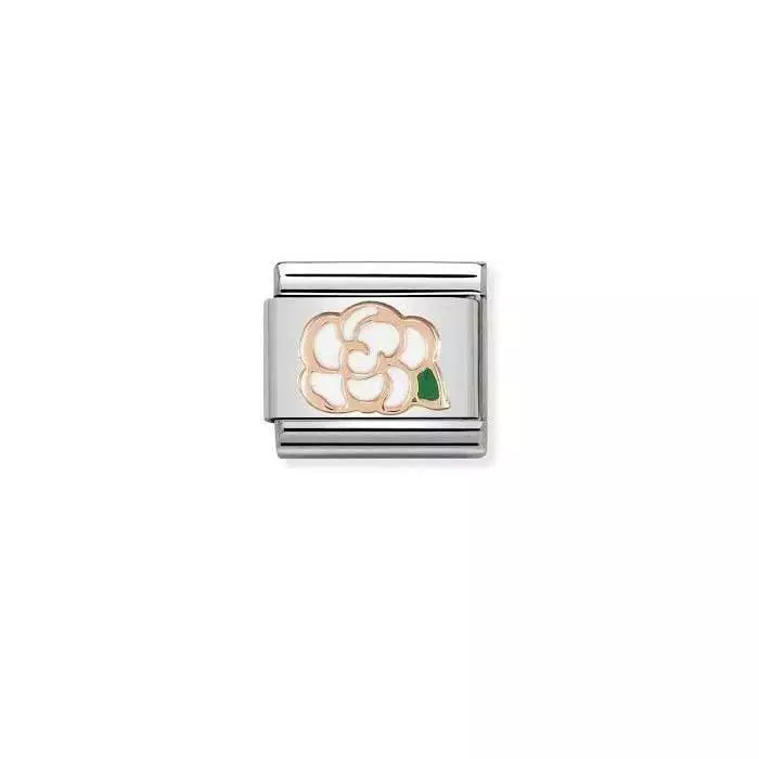 Nomination Classic rose gold sarjan pala valkoisella kamelia-kukalla. Koruosa on 9 karaatin ruusukultaa. Tämä herttainen kukka-pala sopii koristamaan monenlaista Nomination-ranneketta!