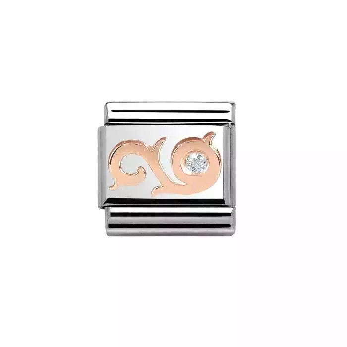 Nomination Classic rose gold sarjan köynnöskuvio-pala zirkonia-korukivellä. Koruosa on 9 karaatin ruusukultaa.
