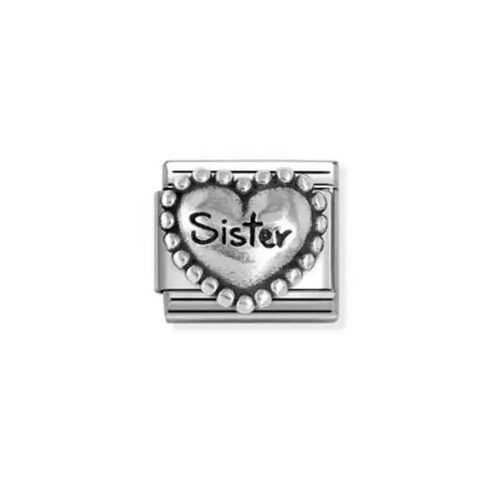 Nomination Classic Silvershine sarjan Sister-pala. Sydämen muotoisen koruosan keskellä on kaiverrus "Sister" eli sisko. Koruosa on materiaaliltaan 925 sterling-hopeaa.